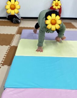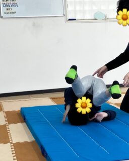 例えば、マットの上で転がる動きは、 体幹の安定だけでなく 平衡感覚(バランスを感じる力) を育てます。 また、手で体を支える動きは 支持力 を高め、 前転や横転などの回転動作は 固有感覚(自分の体の位置を感じる力) を育てるのにとても効果的です。